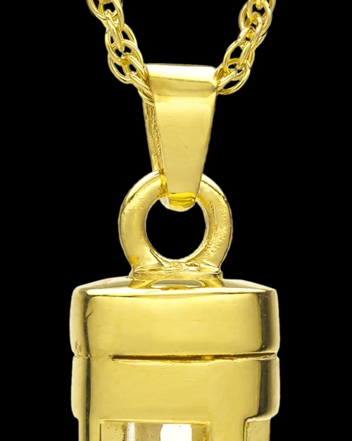 The 14 Karat Yellow Gold Captivating Cylinder cremation jewelry is a unisex pendant that helps you to cherish a memory of your loved one. The Captivating Cylinder gold pendant has a small interior that is fashioned to hold approximately a pinch of cremated ashes or another tribute that holds special meaning. A small piece of a favorite article of clothing, a scroll with handwritten words, whatever you choose to put inside. Shipping times for 14 Karat gold jewelry is three to four weeks and we even include a free chain with your purchase. Size: 1/4" w x 1" h