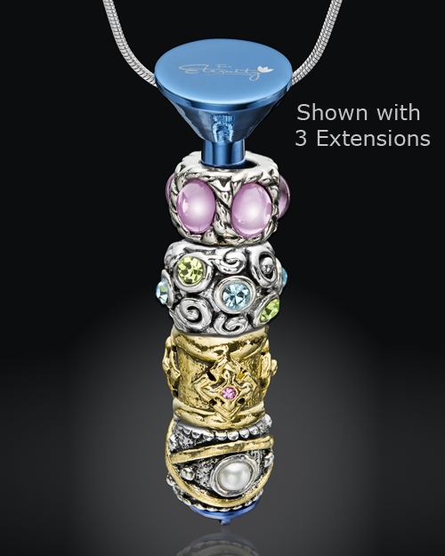 Bold, beautiful and brilliant blue plating is the accent star with the Kindly Charm and Blue Plated Millenium jewelry urn. This exceptional blue Millenium steals the show with it's gorgeous color and great reflective properties. It really forces the Kindly bead in rose, white and pink to make a statement against the blue and it's a great gift idea for a mom looking to wear a reminder of her sons and her daughters, perhaps a grandmother that has a ton of bead charms from other manufacturers and the clasp is too difficult to work on a bracelet. Options a plenty with this great pendant and charm! Patent Pending. Size: 1/2" w x 1-3/8" h
