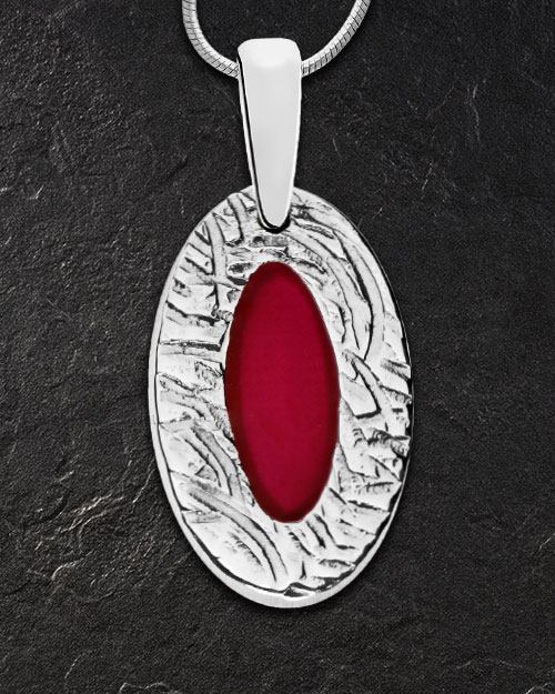 This stunning Capistrano Oval Silver Ash Jewelry is an excellent way to show off love, devotion and dedication for someone in your life that has passed. The oval shaped pendant is made of sterling silver and is heirloom quality. The front face of the oval has great detail that adds extra dimension to the pendant. The center of the oval is made of transparent zinnia color gemstone like resin and we combine a very small amount of cremated ashes with the resin. The resin hardens and then we polish the pendant by hand to a brilliant shine. Each Capistrano Oval Silver Ash Jewelry includes gift box presentation and a matching chain.