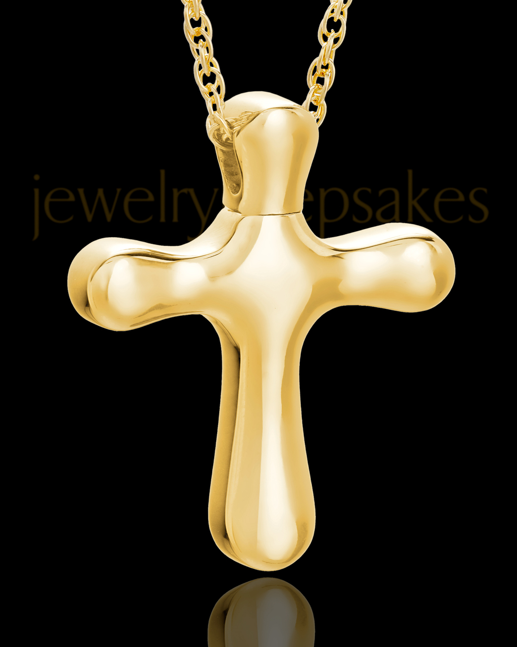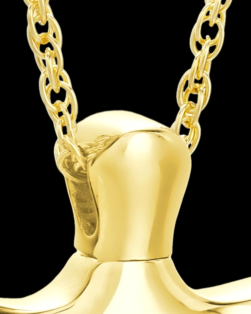 Our exceptional Kester Cross cremation jewelry has been delicately crafted of solid 14 karat gold and includes a small inner compartment to hold your choice of remembrances. The 14 karat Kester Cross cremation locket is a customer favorite as the design is more on the modern side and the soft rounded edges make it appealing to men and women as well as young adults. The top part of the Kester Cross can be untwisted and you will see the inside where you place the remembrance that you select. Each Kester Cross ash urn pendant includes your choice of matching chain or cording and you can add some engraved text in block or script font to the back of your jewelry urn. Size: 1" w x 1" h