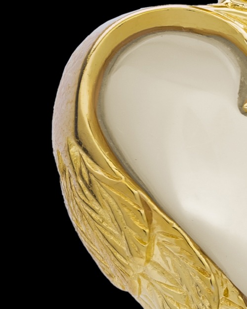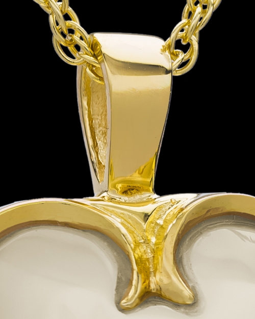 This beautiful gold plated Winged Heart funeral jewelry is a terrific way to remember and remind yourselves of those you have loved and lost. Delicately crafted of 14 karat gold plated over sterling silver, each Winged Heart has a mother of pearl center and etchings along the side of the heart. Because the Gold Winged Heart is gold plated in lieu of solid gold, you have the luxury of a gold keepsake but at a much more affordable cost. The center mother of pearl heart reflects the beauty of the 14 karat gold plating and the overall look of the Winged Heart in gold is one of sophistication and simplicity. Embrace the rich accents on the side of the heart and gently reflect on your memories of your loved one. You can select a gold filled chain or black satin cording. Size: 3/4" w x 3/4" h