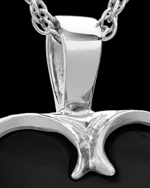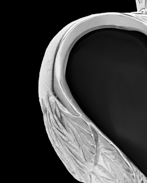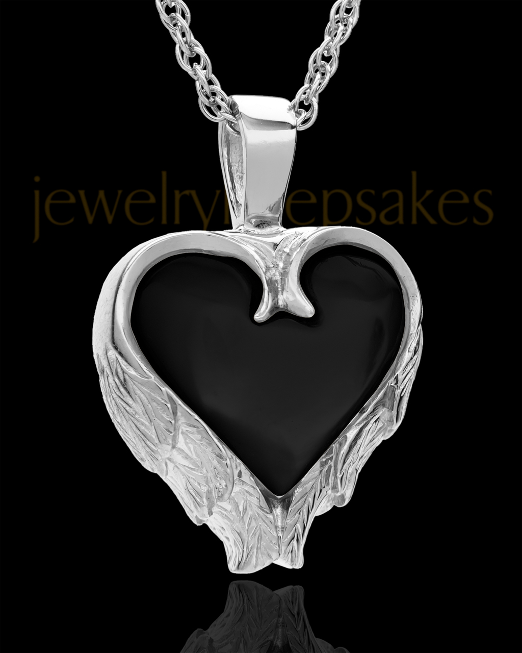 This beautiful sterling silver Onyx Winged Heart is a beautiful way to honor and remember a loved one that has passed away. Crafted of sterling silver with an onyx center, the heart includes a small filling kit as well as your choice of cordings or chains that are a beautiful compliment to the keepsake. The center stone is dark black onyx which is a bold and striking way to accent the softer silvery tones of the sterling silver. Down along each side of the Onyx Winged Heart you will find flowing wing accents, almost like the heart was wrapped up in an angelic embrace. The back side of the Silver Onyx Winged Heart jewelry urn can be personalized with text that matches their name, a special date or even a phrase they spoke often. Add a remembrance to the interior and seal. Size: 1" w x 1" h