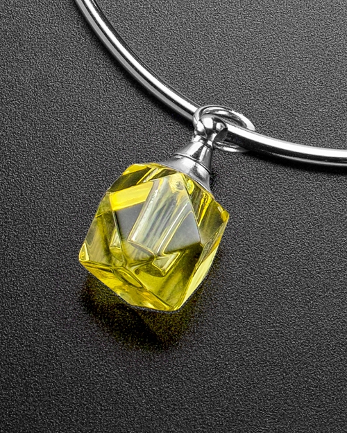 Your memories will find a delightful resting place when you select the Sophisticate Yellow Cubes memorial locket. This personal and sweet cremation bracelet is stainless steel and the Sophisticate bracelet has been polished to a high shine. The attached Yellow Cubes cremation jewelry has a very small inside that is accessed by removing the silver rhodium cap on the top. The cheery and sunny yellow color of the Yellow Cubes cremation pendant that is attached to the bracelet may brighten up the dark days that we have and the color compliments every skin tone. The color of the Yellow Cubes is also very neutral and will pair nicely for day to day accessorizing with your attire. Size: 1/2" w x 1/2" h