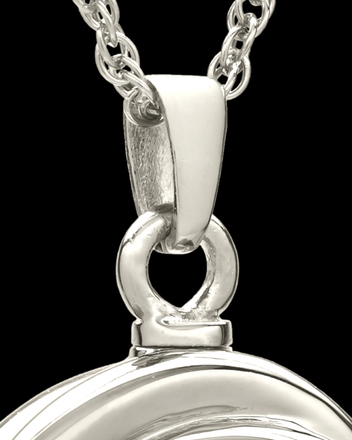 Our Ringed Eternity cremation urn locket has been crafted of solid 14 karat white gold and contains a small inner compartment that will hold your chosen remembrance. It is difficult to tell where one ring begins and another ends and the unique design of the Ringed Eternity shows it to be three rings that have all merged into one pendant. The bail at the top is where you can find the entry to the inside where you add the tribute that you feels reminds you most of the deceased. Each Ringed Eternity cremation necklace is hand crafted and has a threaded stopper to keep your remembrance secured inside your death pendant. Delivery times vary but expect two to three weeks. Size: 3/4" w x 3/4" h