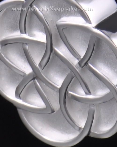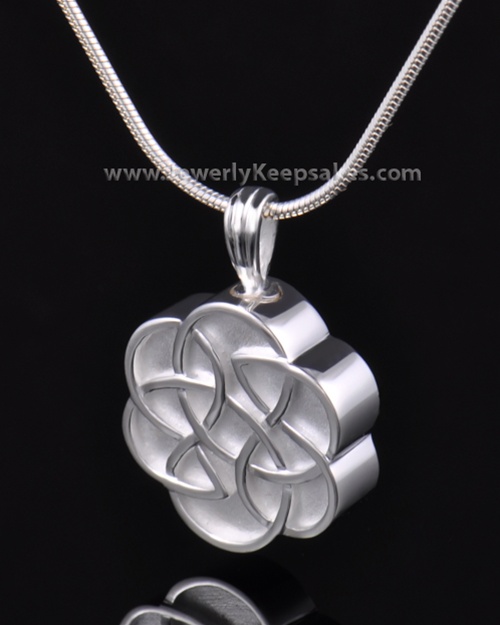 Choose this exquisite sterling silver Celtic Daisy urn pendant as a loving remembrance of someone in your life no longer with you. The beautiful design is trendy and unique and the bail unscrews to expose a generous interior. Add some cremated ashes, a few strands of hair or even some dried and crushed flowers from a favorite funeral arrangement. We love the rich beauty of the Silver Celtic Daisy cremation jewelry and having the difference in finishes between a brushed finish and a smooth texture adds great contrast to the overall keepsake. We do recommend that you never wear your Silver Celtic Daisy in water or clean the pendant with harsh chemicals as that can damage the surface. Size: 3/4" w x 3/4" h